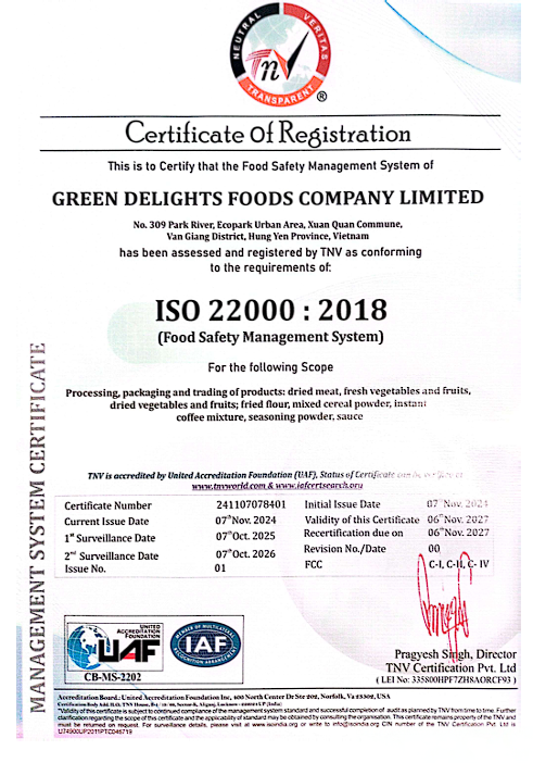 Được chứng nhận bởi ISO 22000:2018 và FAO về nông sản sạch hữu cơ.